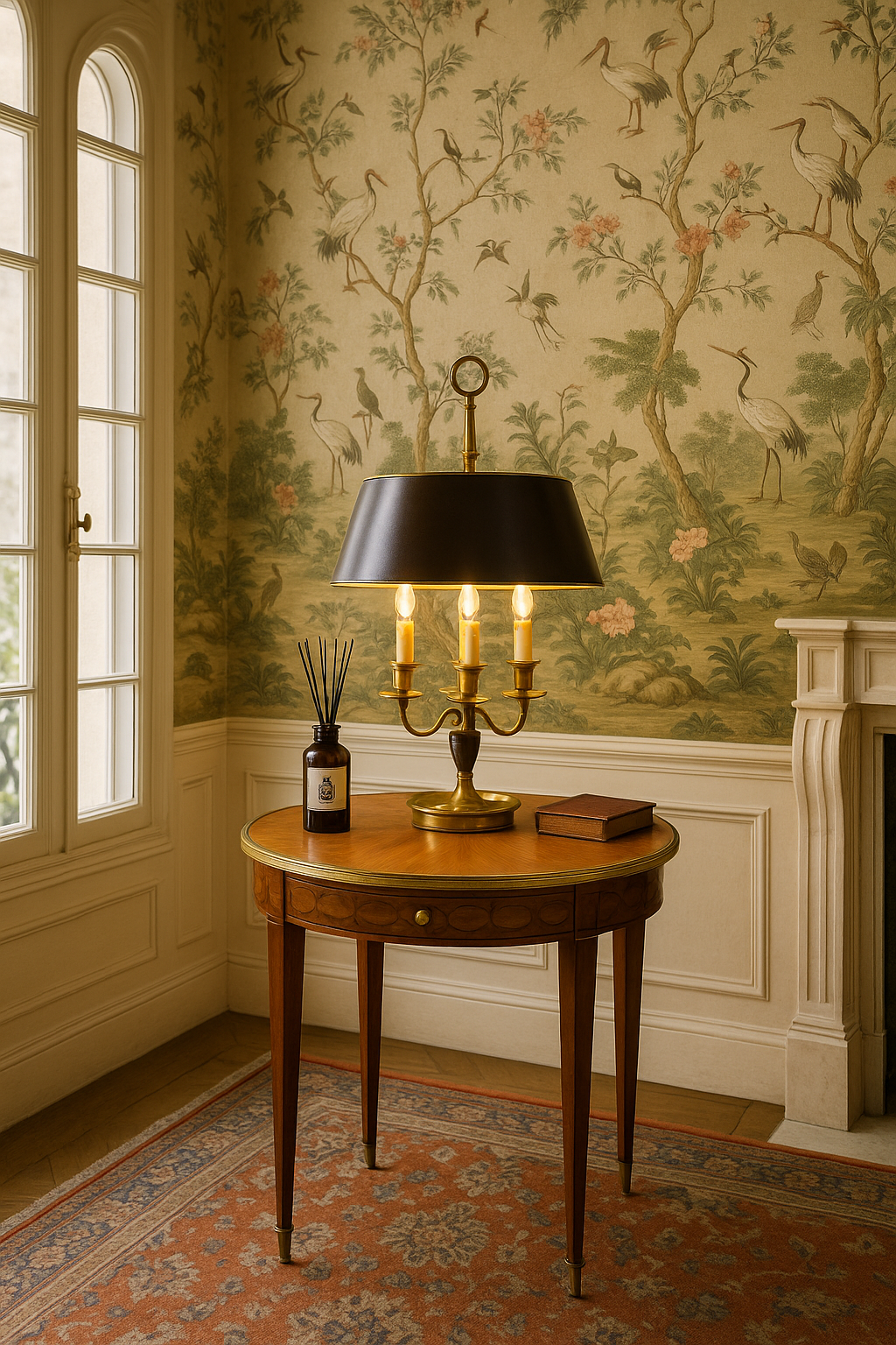 Bouillotte stolić izrađen je krajem 19.st. u stilu Louisa XVI/neoklasicizma. Ukrašen je majstorski izvedenim intarzijama s motivima medaljona i stiliziranih baklji, tipičnih za estetiku razdoblja Louis XVI. Dodatni ukras čini furnir ploče stola u obliku sunčanih zraka obrubljen mjedenim obručem.