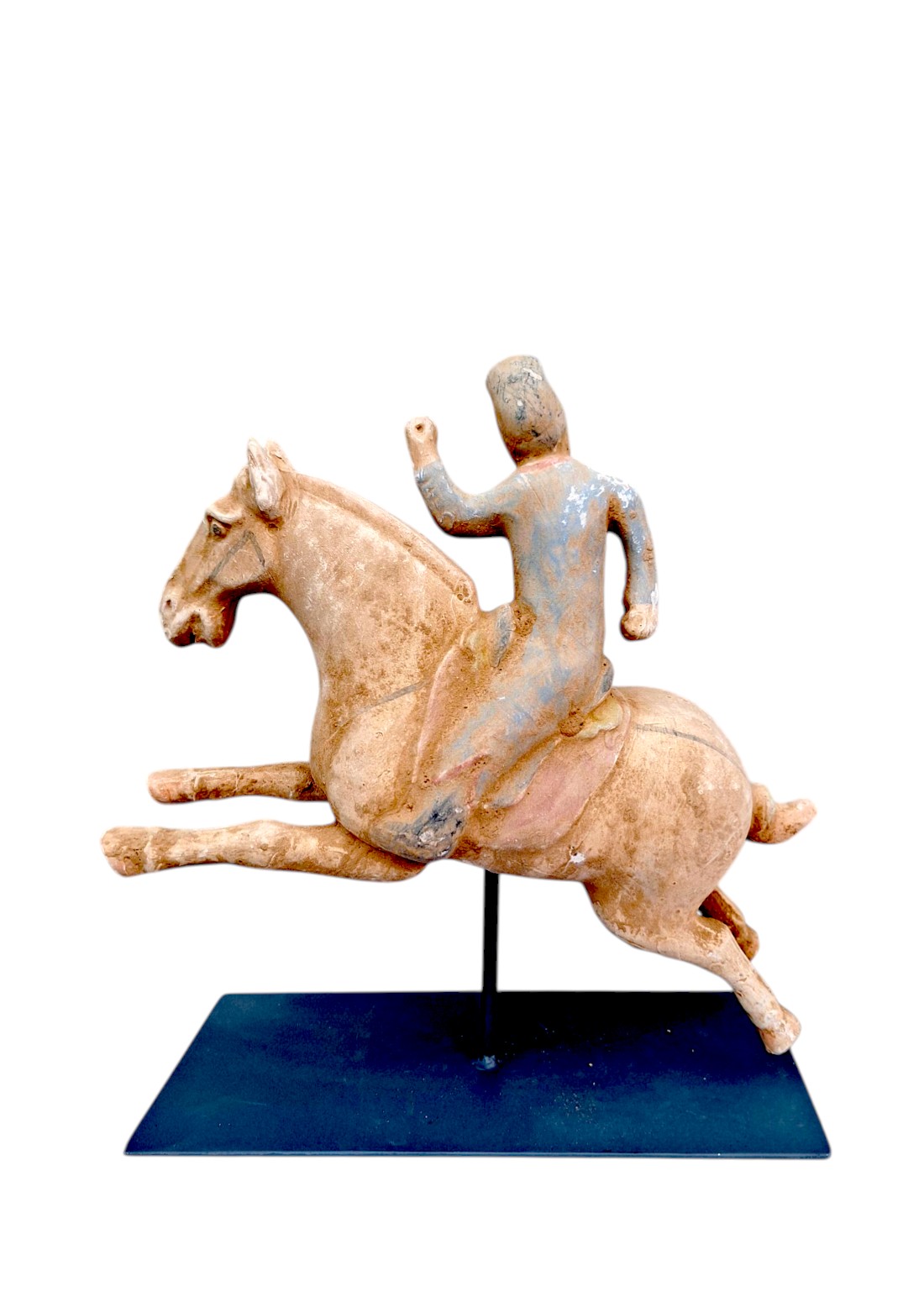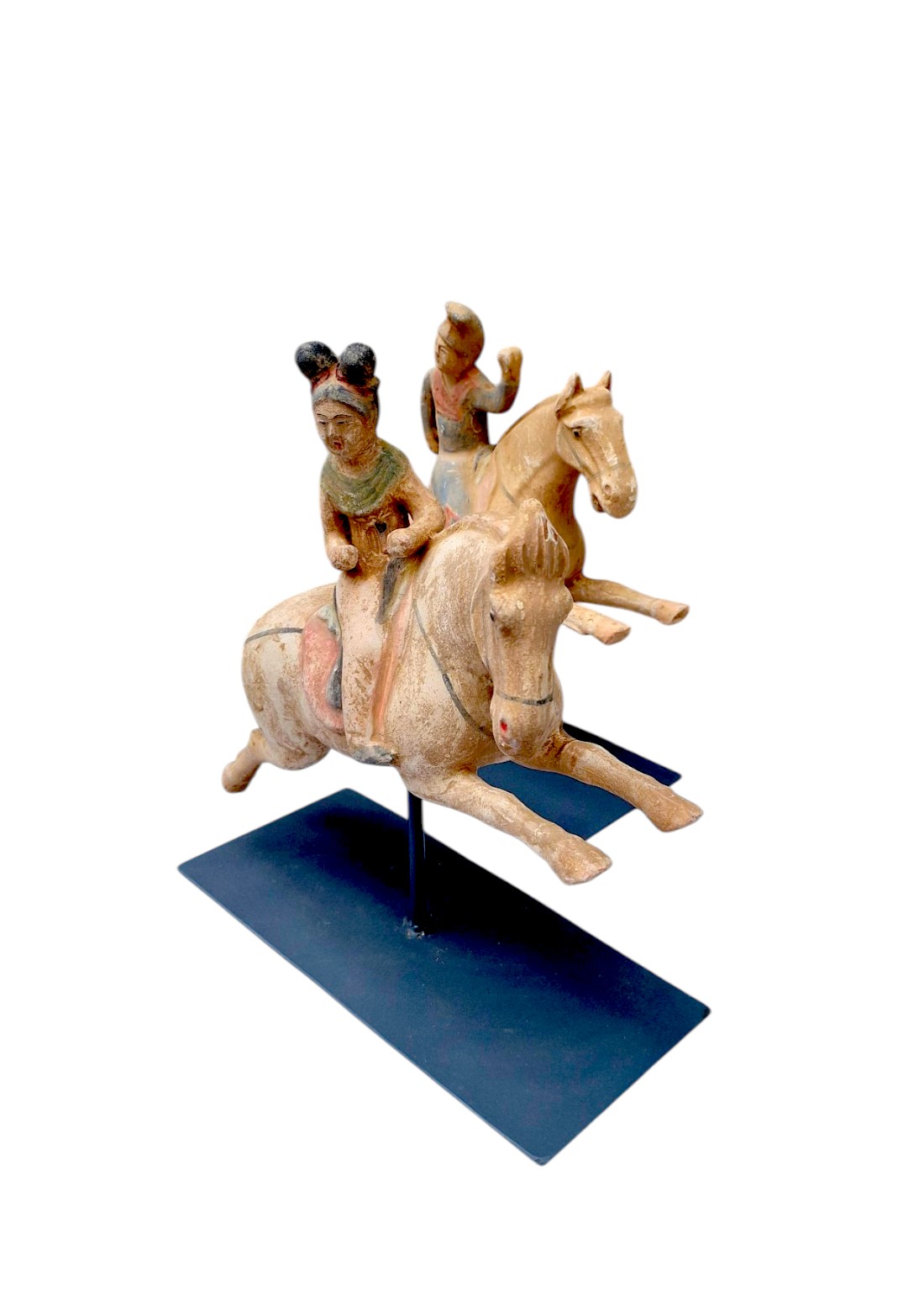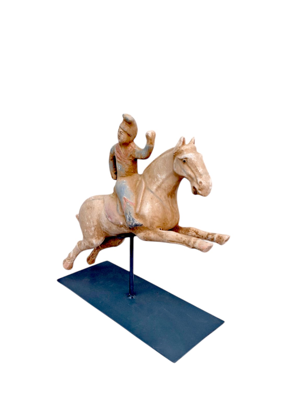 Figura jahača na konju inspirirana je kineskim keramičkim figurama iz razdoblja dinastije Tang (7.-9.n.e.). Snažan konj u pokretu, stilizirani prikaz jahača i suzdržani tragovi polikromije daju ovom komadu prepoznatljiv karakter dalekoistočne umjetničke tradicije.