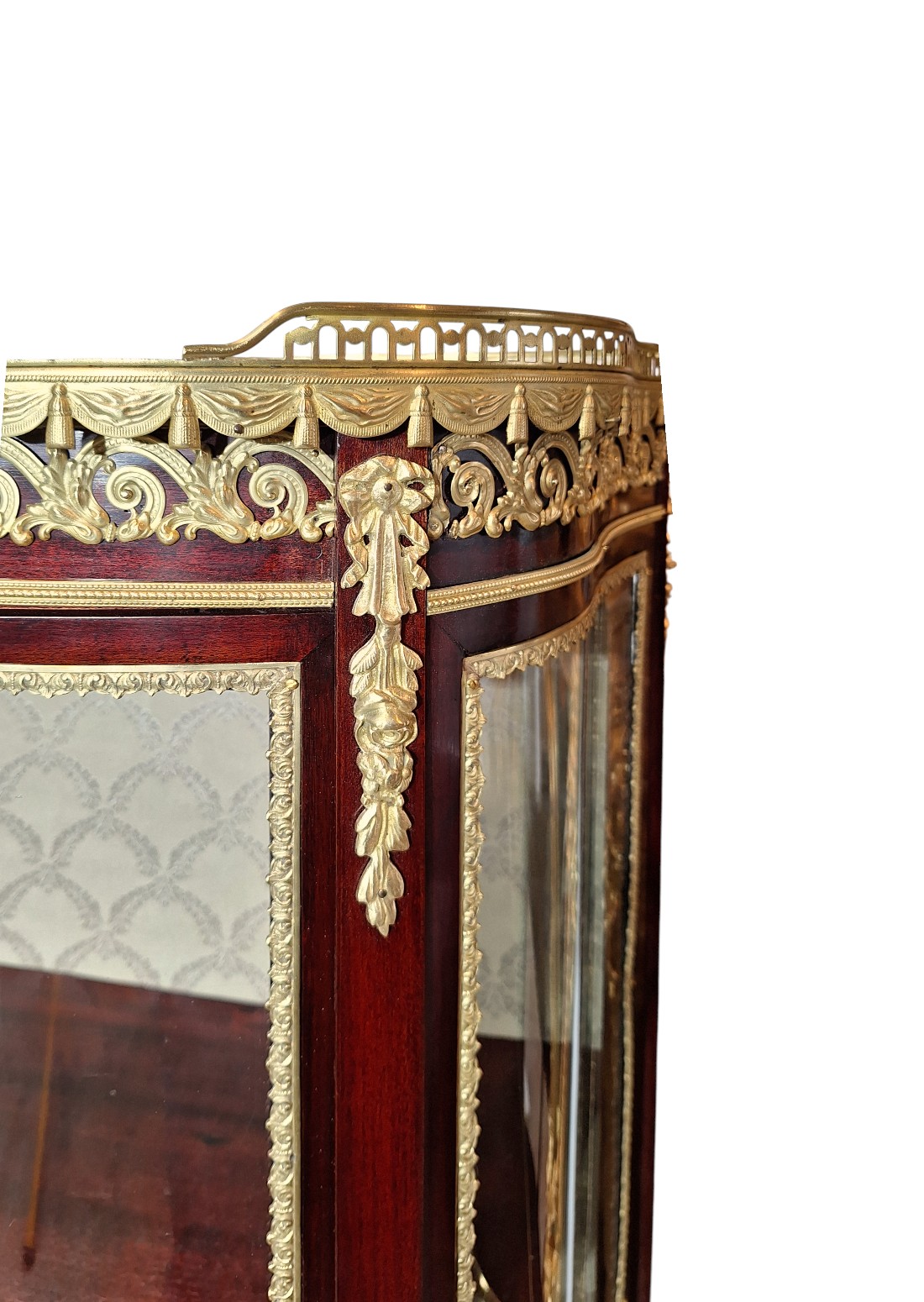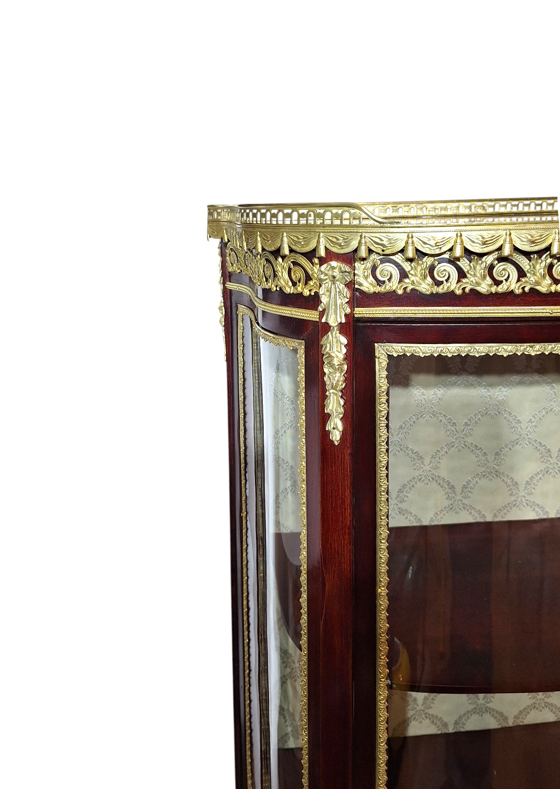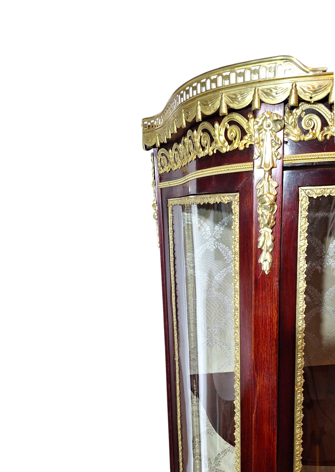 Ova elegantna, salonska kristalijera nastala je drugoj  polovici 19.st., u razdoblju Second Empire ili Napoleon III, koje je trajalo između 1860 i 1885. Ovaj stil slavio je luksuz, sjaj i povratak povijesnim uzorima. Doba je to velikog revivala stila Louis XV, izvorno stila prve polovice 18.st. Kristalijera je u besprijekornom stanju. Svi dijelovi, uključujući i staklene, su originalni osim tkanine kojom je presvučena stražnja strana korpusa. Izrađena je od punog mahagoni drveta s bogatom dekoracijom od tucane mjedi najfinije izrade i mramornom pločom na vrhu, koja ju je štitila od vatre svijeća iz svijećnjaka. Mjedene dekoracije u formi friza ili girlande estetika su francuskih palača 19. stoljeća. Zaobljeni stakleni dijelovi imaju takozvanu bombé formu stvarajući dojam kao da su napuhani.