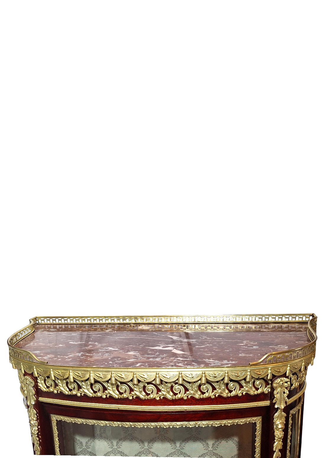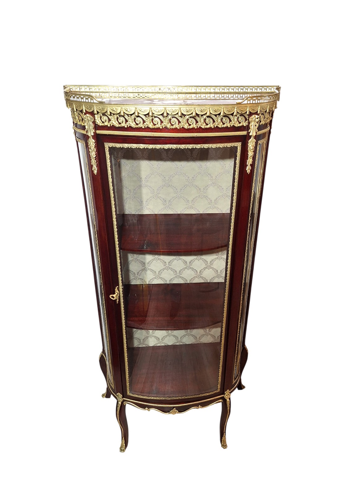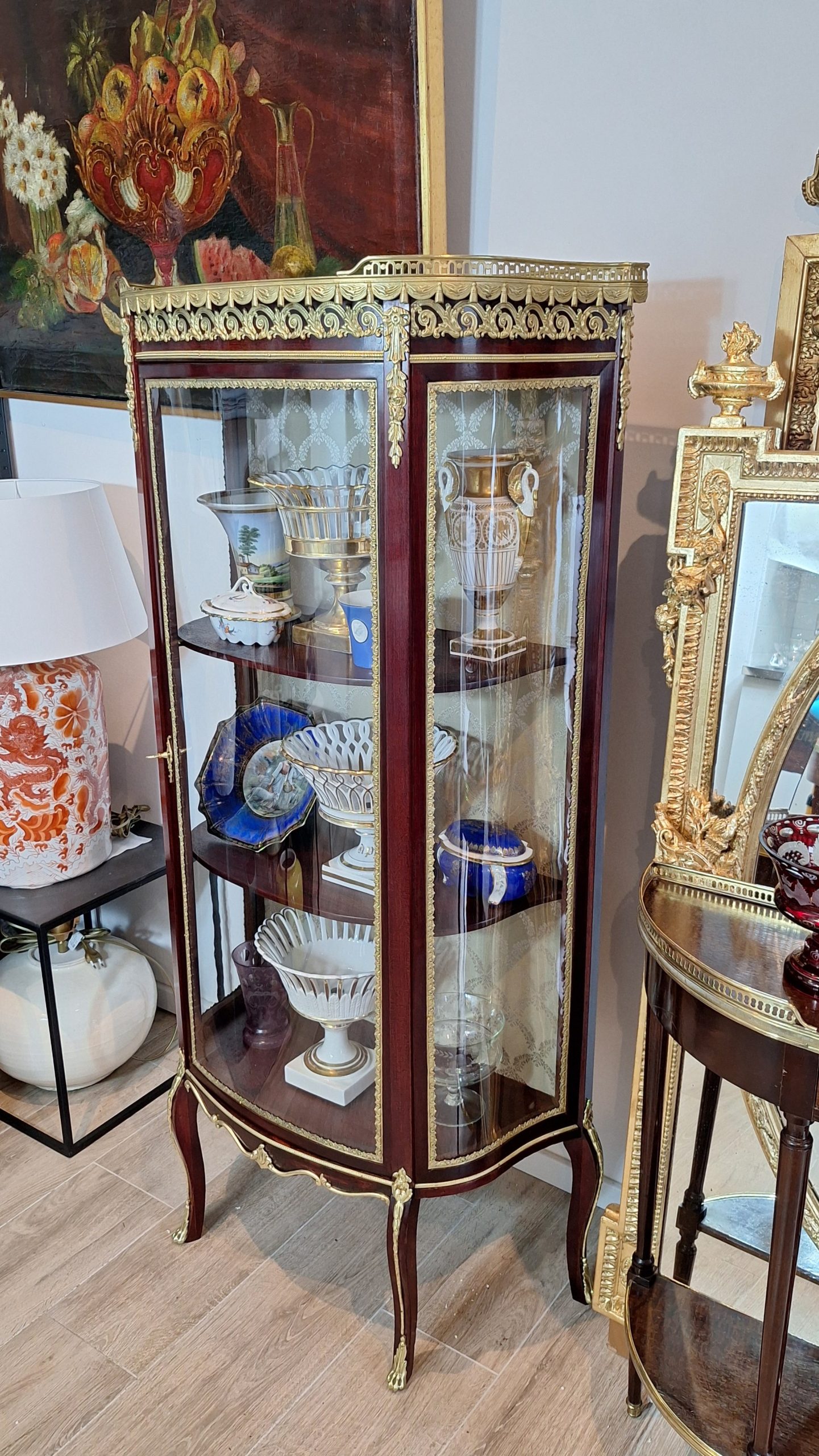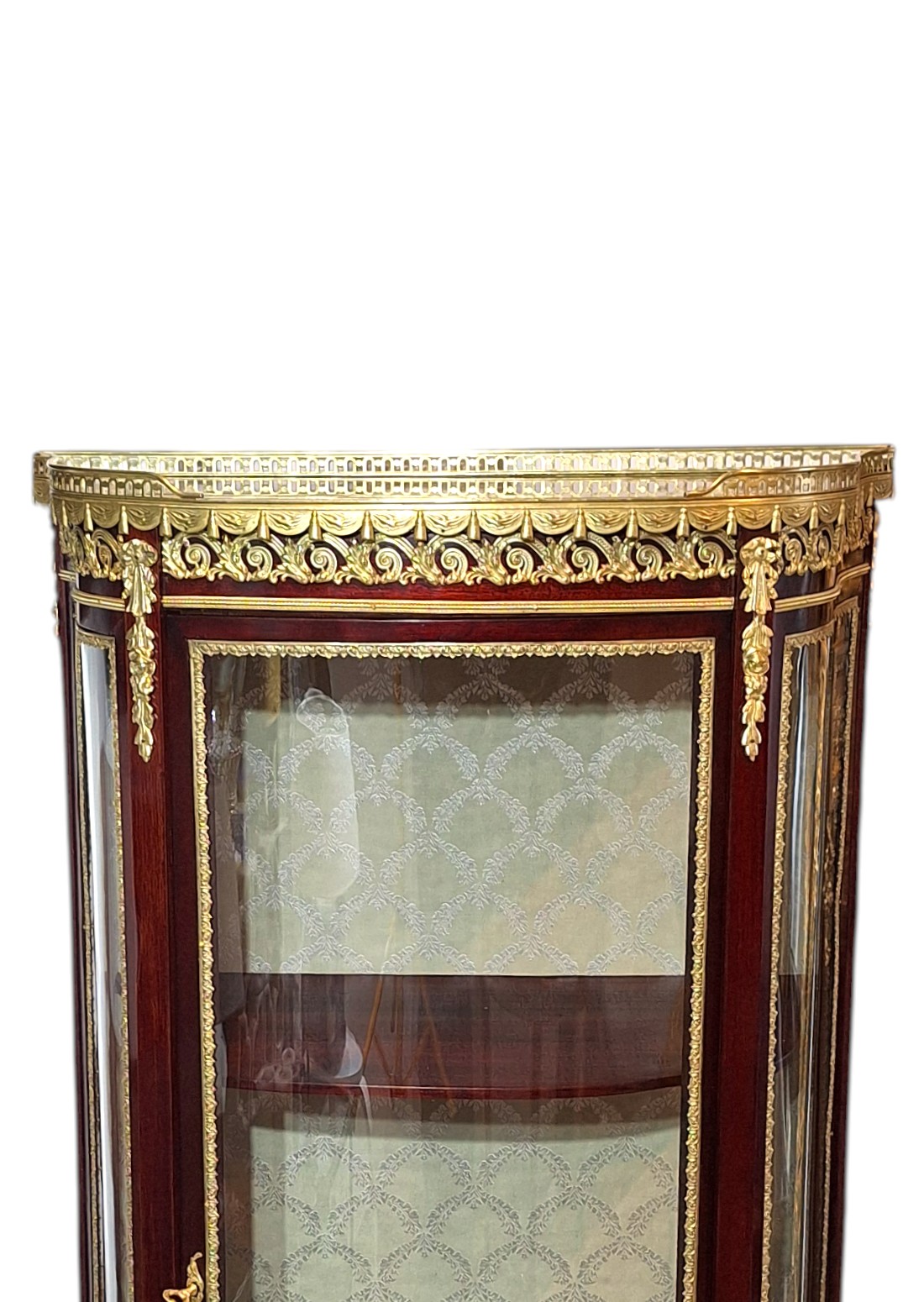 Ova elegantna, salonska kristalijera nastala je drugoj  polovici 19.st., u razdoblju Second Empire ili Napoleon III, koje je trajalo između 1860 i 1885. Ovaj stil slavio je luksuz, sjaj i povratak povijesnim uzorima. Doba je to velikog revivala stila Louis XV, izvorno stila prve polovice 18.st. Kristalijera je u besprijekornom stanju. Svi dijelovi, uključujući i staklene, su originalni osim tkanine kojom je presvučena stražnja strana korpusa. Izrađena je od punog mahagoni drveta s bogatom dekoracijom od tucane mjedi najfinije izrade i mramornom pločom na vrhu, koja ju je štitila od vatre svijeća iz svijećnjaka. Mjedene dekoracije u formi friza ili girlande estetika su francuskih palača 19. stoljeća. Zaobljeni stakleni dijelovi imaju takozvanu bombé formu stvarajući dojam kao da su napuhani.
