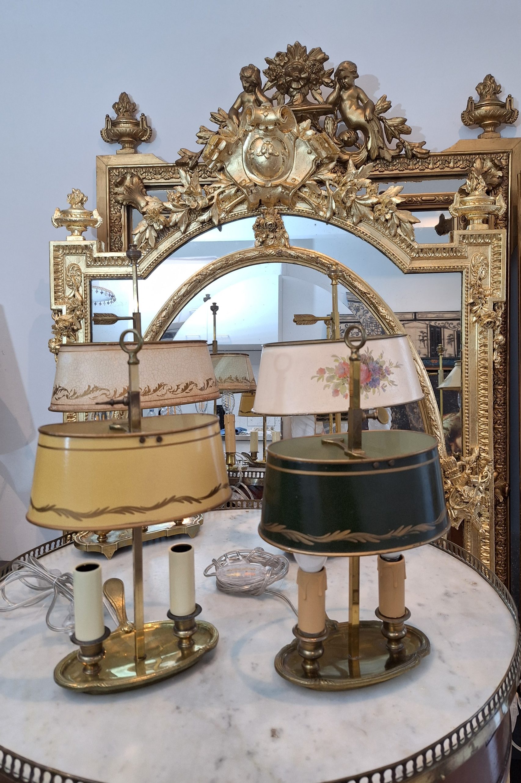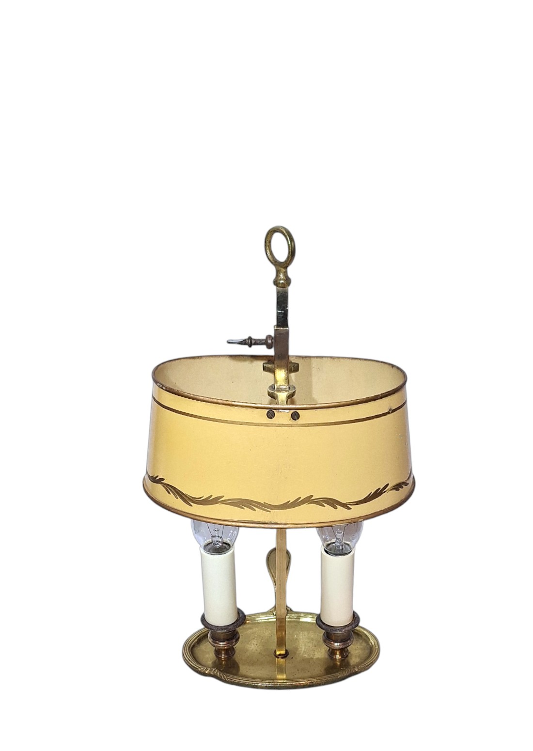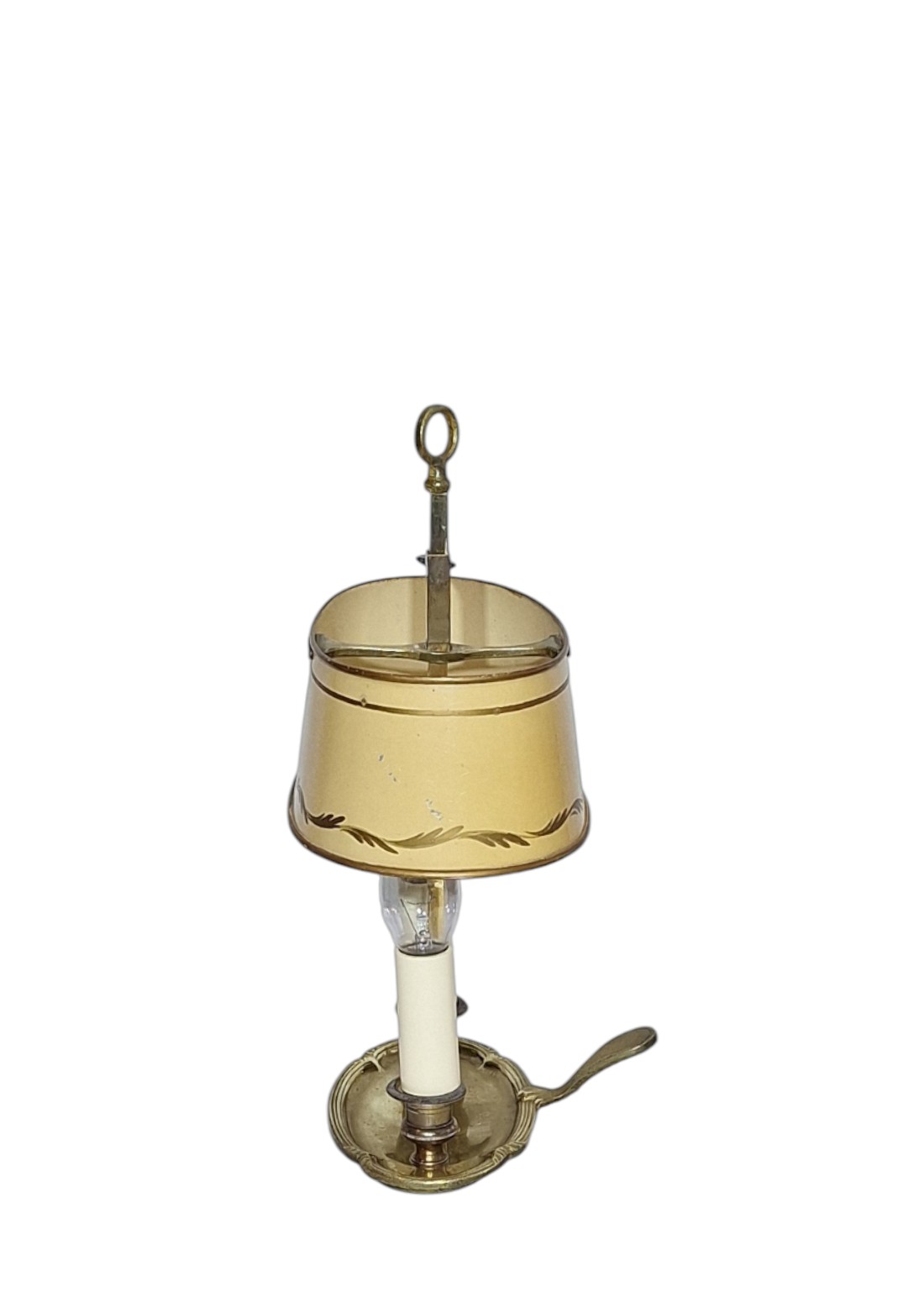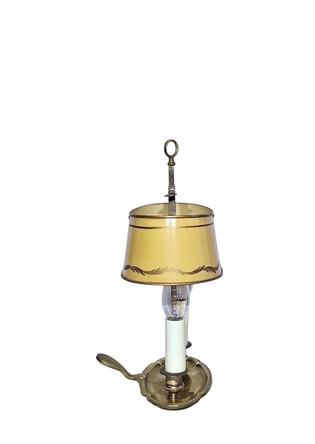 Ovo je mini ili bureau verzija klasične bouillotte (bujot) stolne lampe, koja se stavljala na pisaće stolove, konzole ili noćne ormariće. Kompaktna, fino profiliranog mjedenog postolja, šarmantna, dječja.