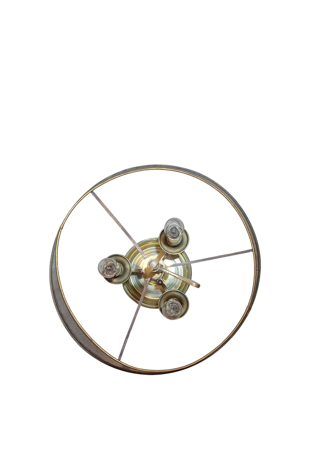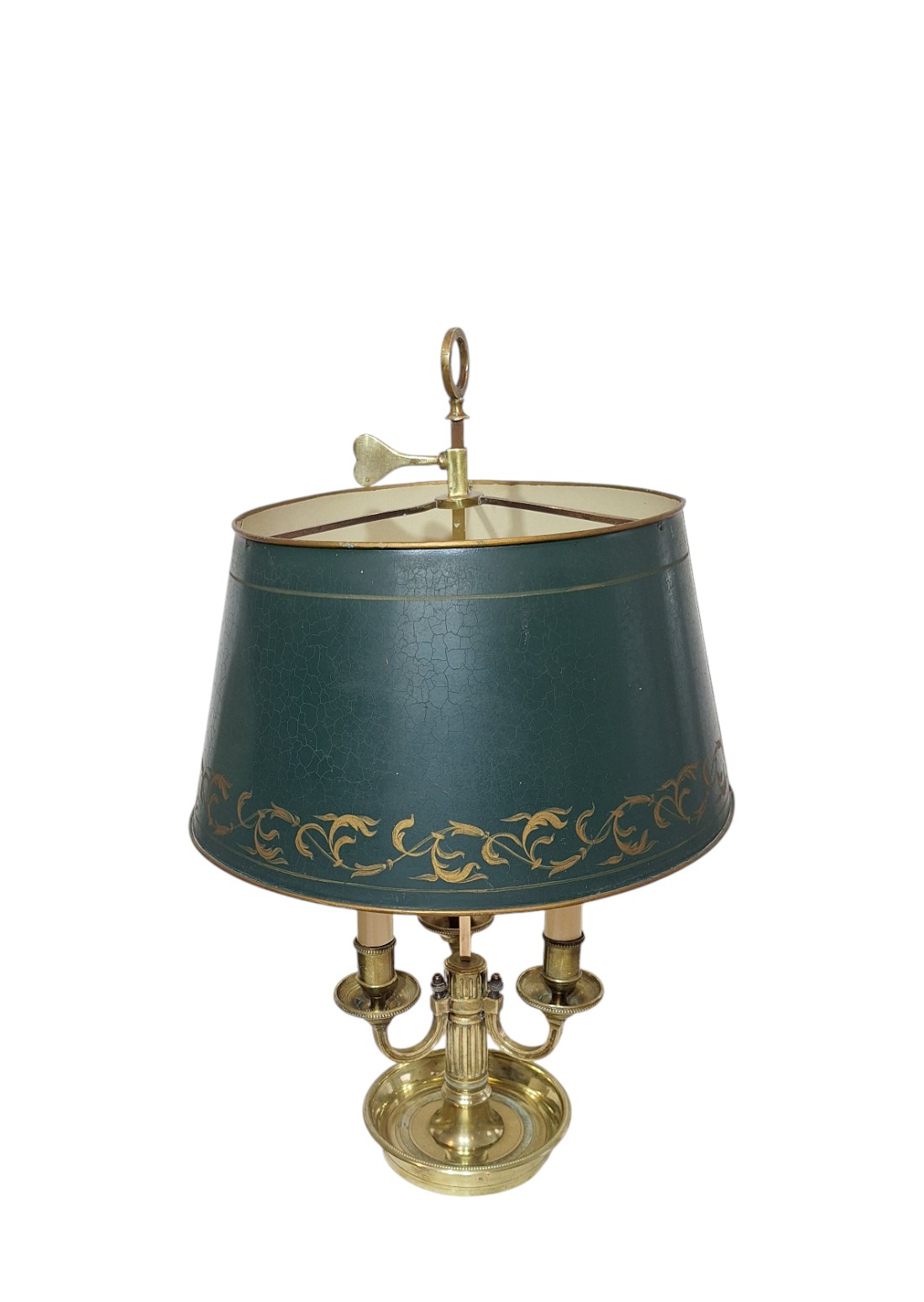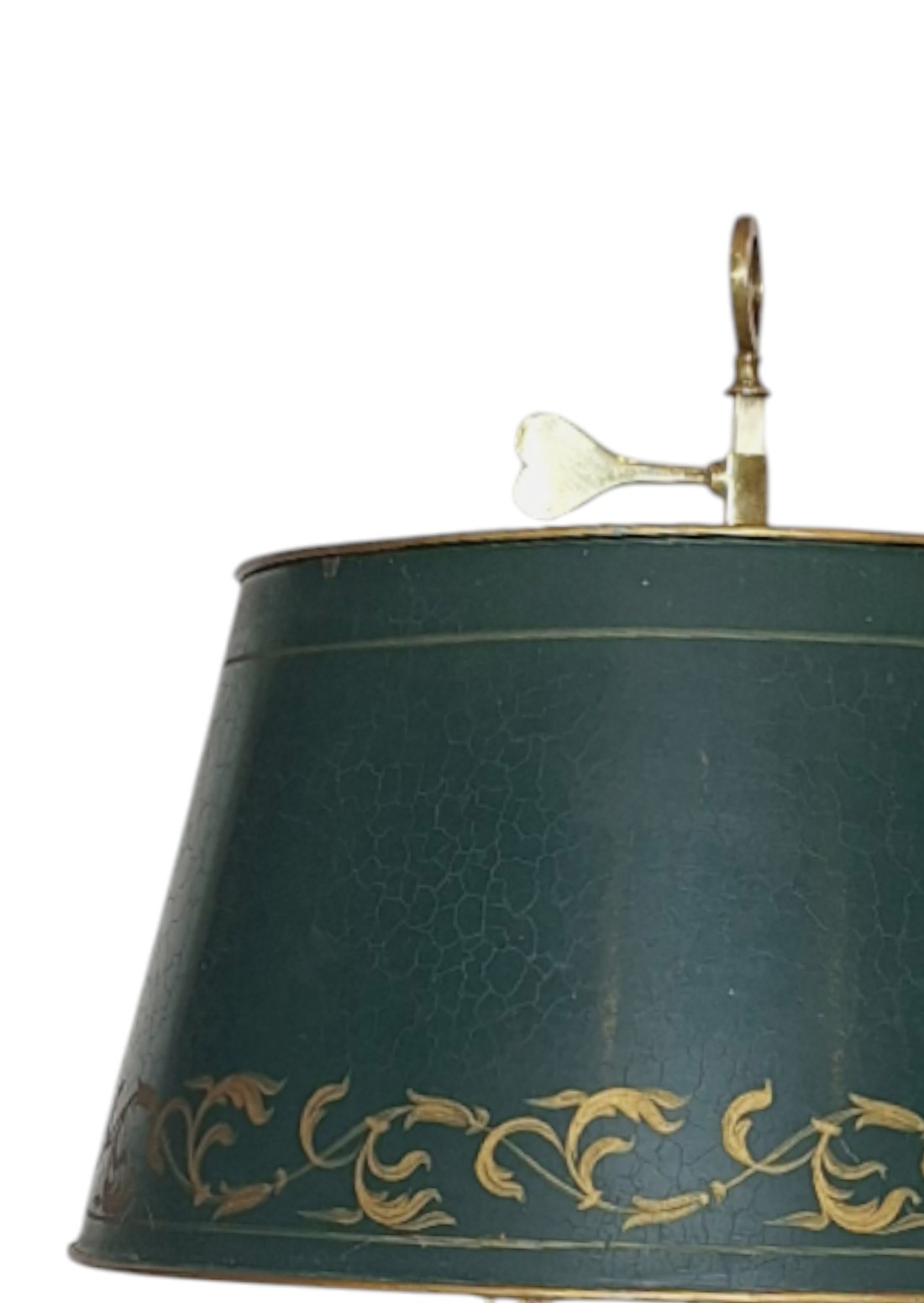 Klasična bouillotte ili bujot stolna lampa sa sjenilom rijetke boje i većih dimenzija. Fini mrežasti uzorak sitnih pukotina na sjenilu nije umjetno napravljen, nego je nastao prirodnim starenjem laka na limenom sjenilu. Lak ima vidljivu dubinu i sjaj starog emajla, a ispod ostaje postojana tamnozelena boja s toplim tonom. Rubovi pukotina imaju blago žučkastu patinu oksidacije, što ukazuje na oksidaciju laka starog više desetljeća. To je prirodan efekt starosti, tipičan za bouillotte lampe iz 1950-ih  koje su bile ručno lakirane i sušene u tankim slojevima. Ovaj utjecaj vremena danas čak povećava dekorativnu i kolekcionarsku vrijednost, jer daje autentičnost.