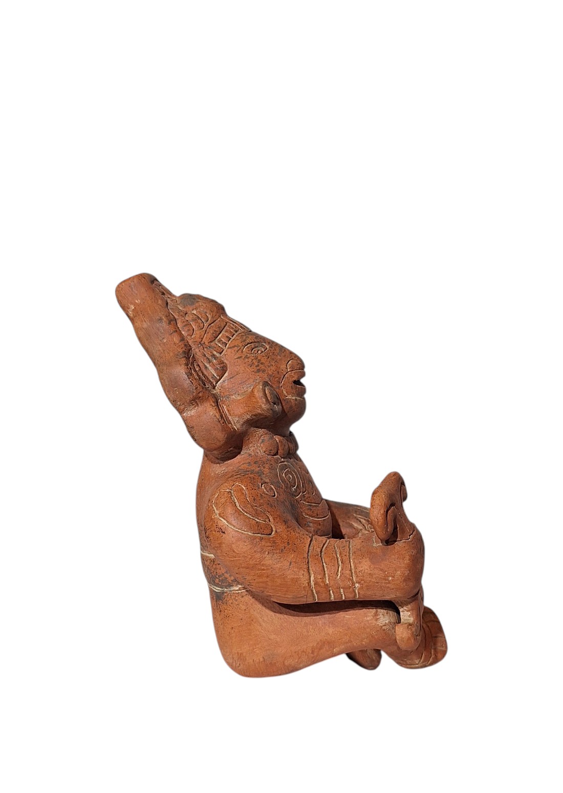 Dekorativna terakota figura izrađena kao muzejska replika (INAH), inspirirana pretkolumbijskom umjetnošću Mezoamerike. Prikazuje stiliziranu osobu višeg društvenog statusa u sjedećem položaju, s naglašenim naušnicama, ogrlicom, ritualnim predmetom u ruci, urezanim ornamentima i karakterističnim motivima na tijelu i odjeći.