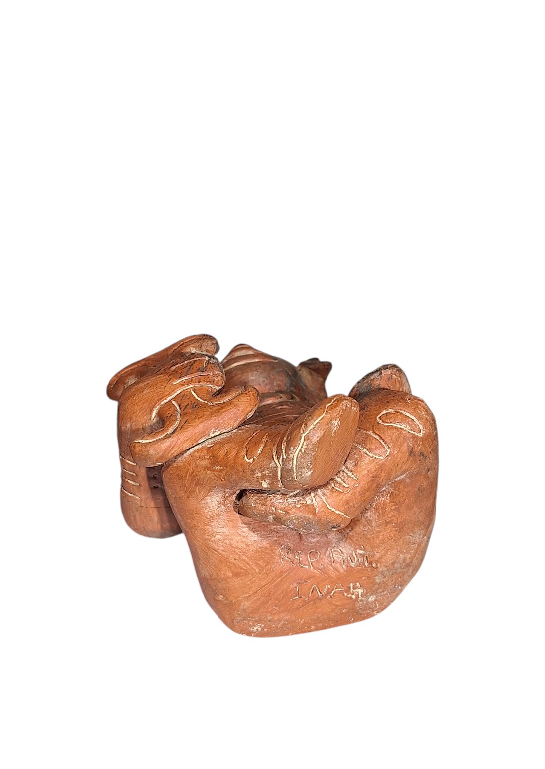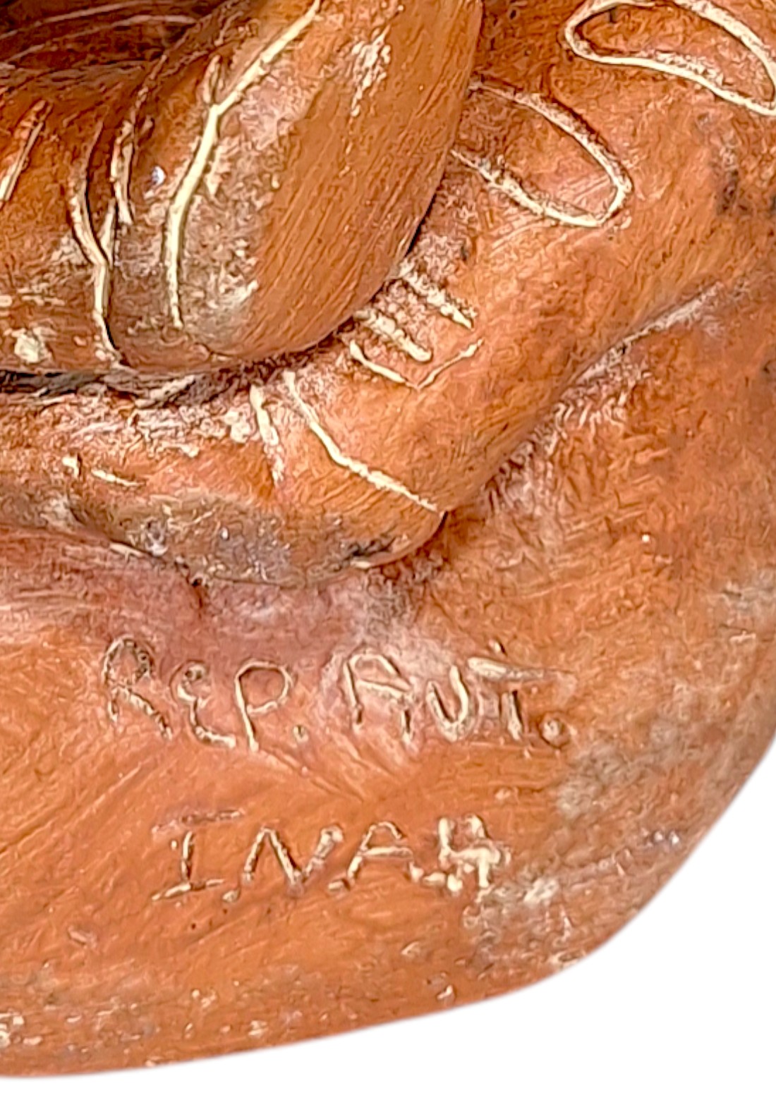 Potpis REP. PAN. INAH. označava da se radi o replici arheološkog artefakta na području zapadnog Meksika proizvedenoj za Instituto Nacional de Antropología e Historia.