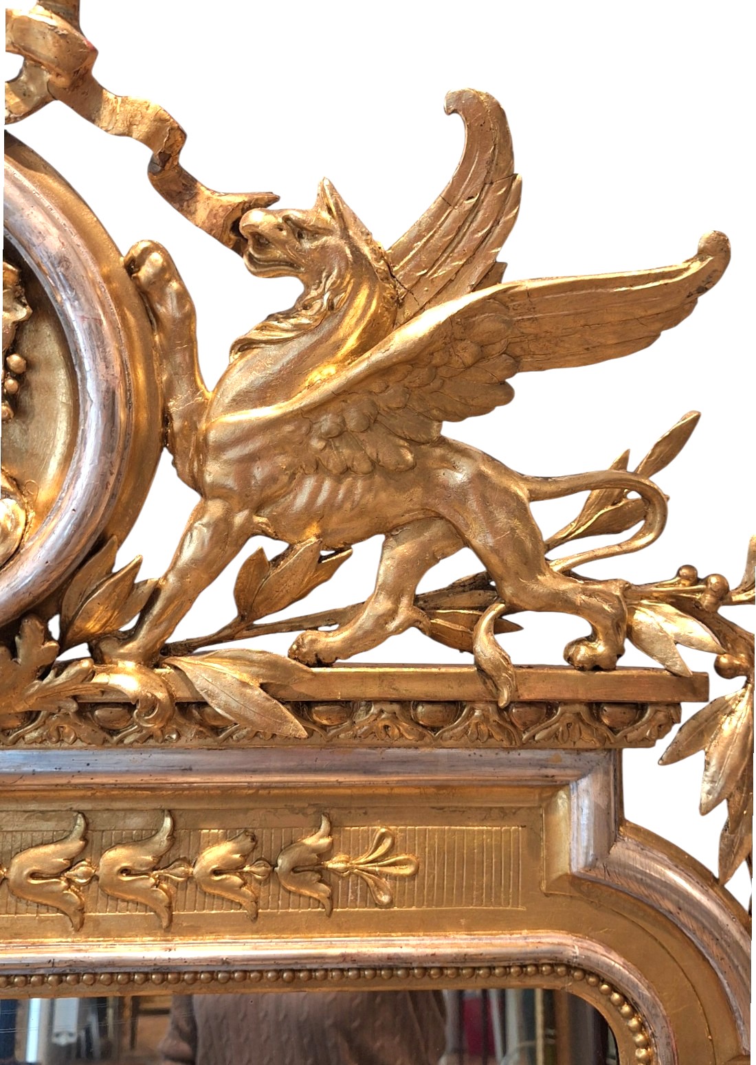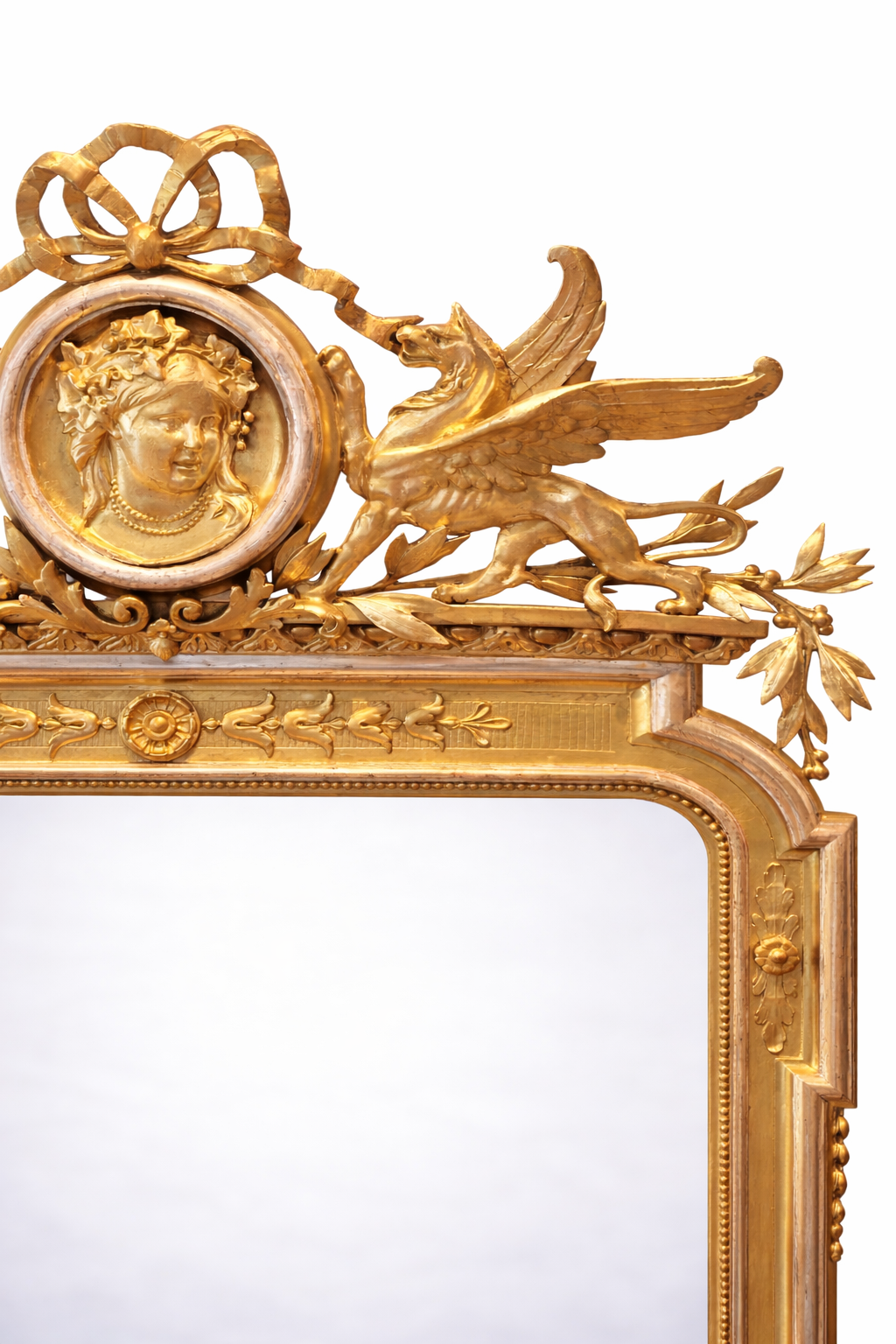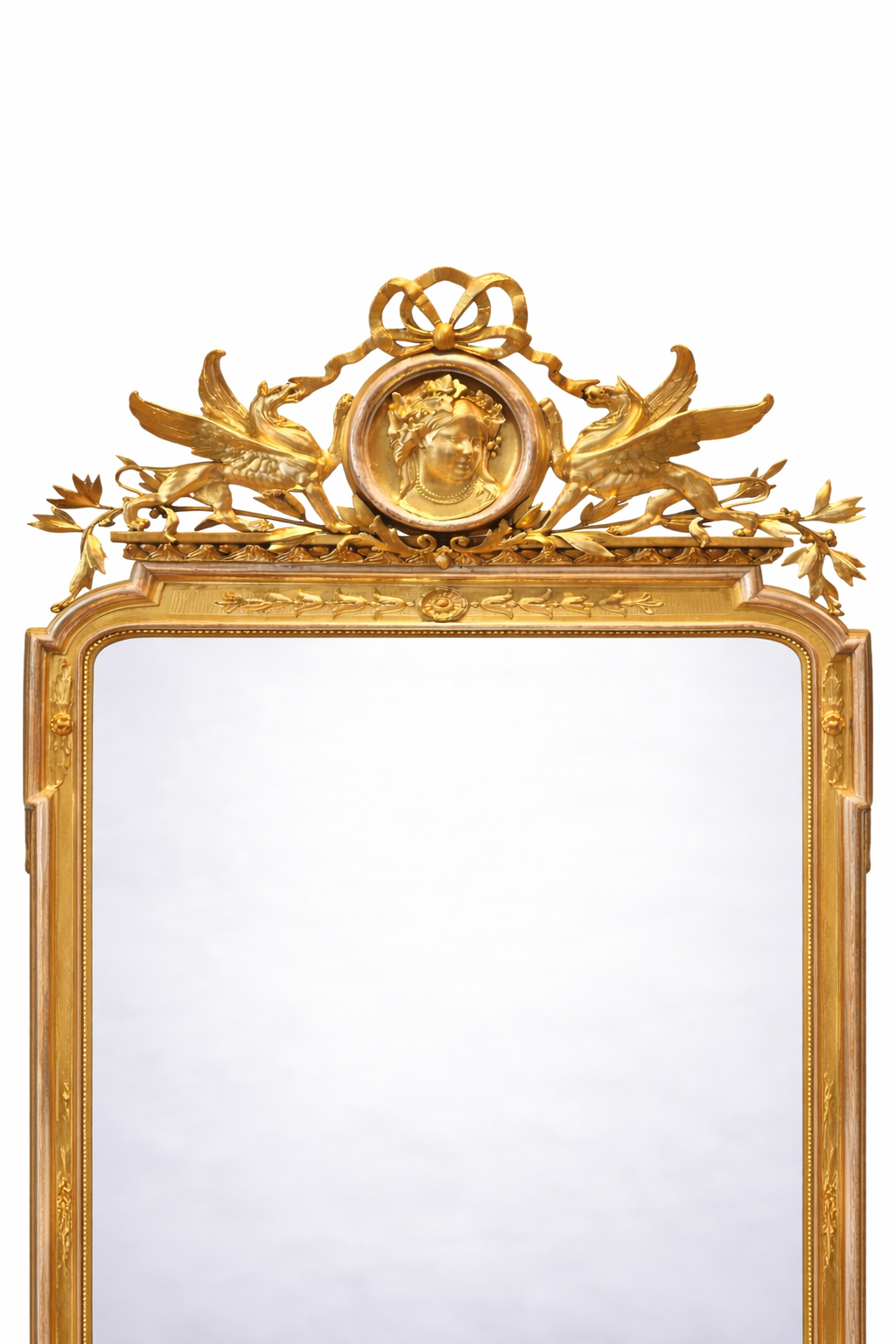 Ovo raskošno, reprezentativno ogledalo u stilu neoklasicizma/ Empire Revivala ima u kruni iznimno bogatu ornamentiku, kakva se rijetko pojavi na tržištu. Bogatom kompozicijom krune dominiraju dvama grifona – krilata mitološka bića i ovalni medaljon sa ženskim profilom. Elegantno ogledalo je kompletno restaurirano i pozlaćeno, a detalji posrebreni. Ogledalo nije došlo iz Francuske već je stoljeće i pol ukrašavalo jedan građanski stan u središtu Zagreba.