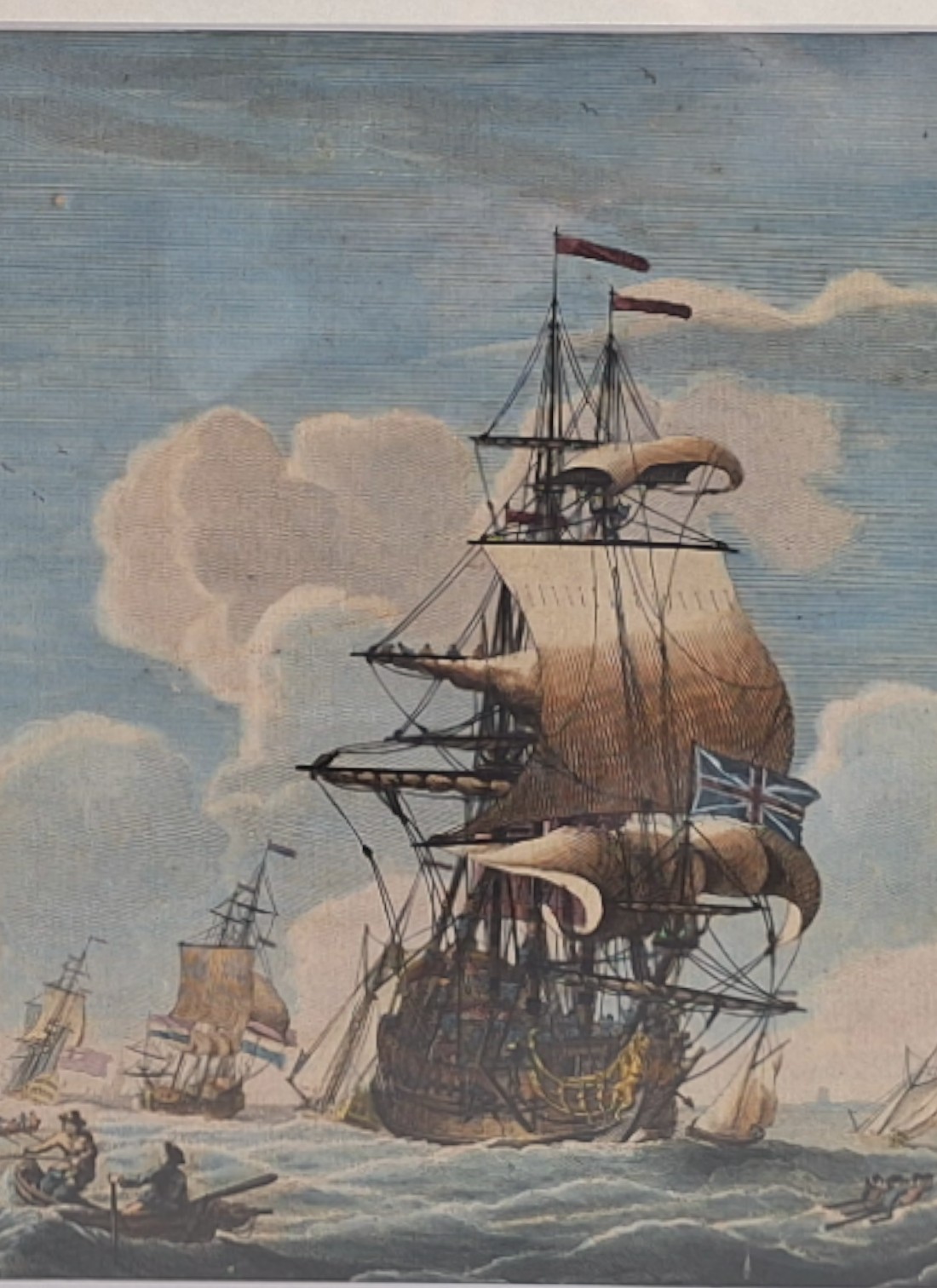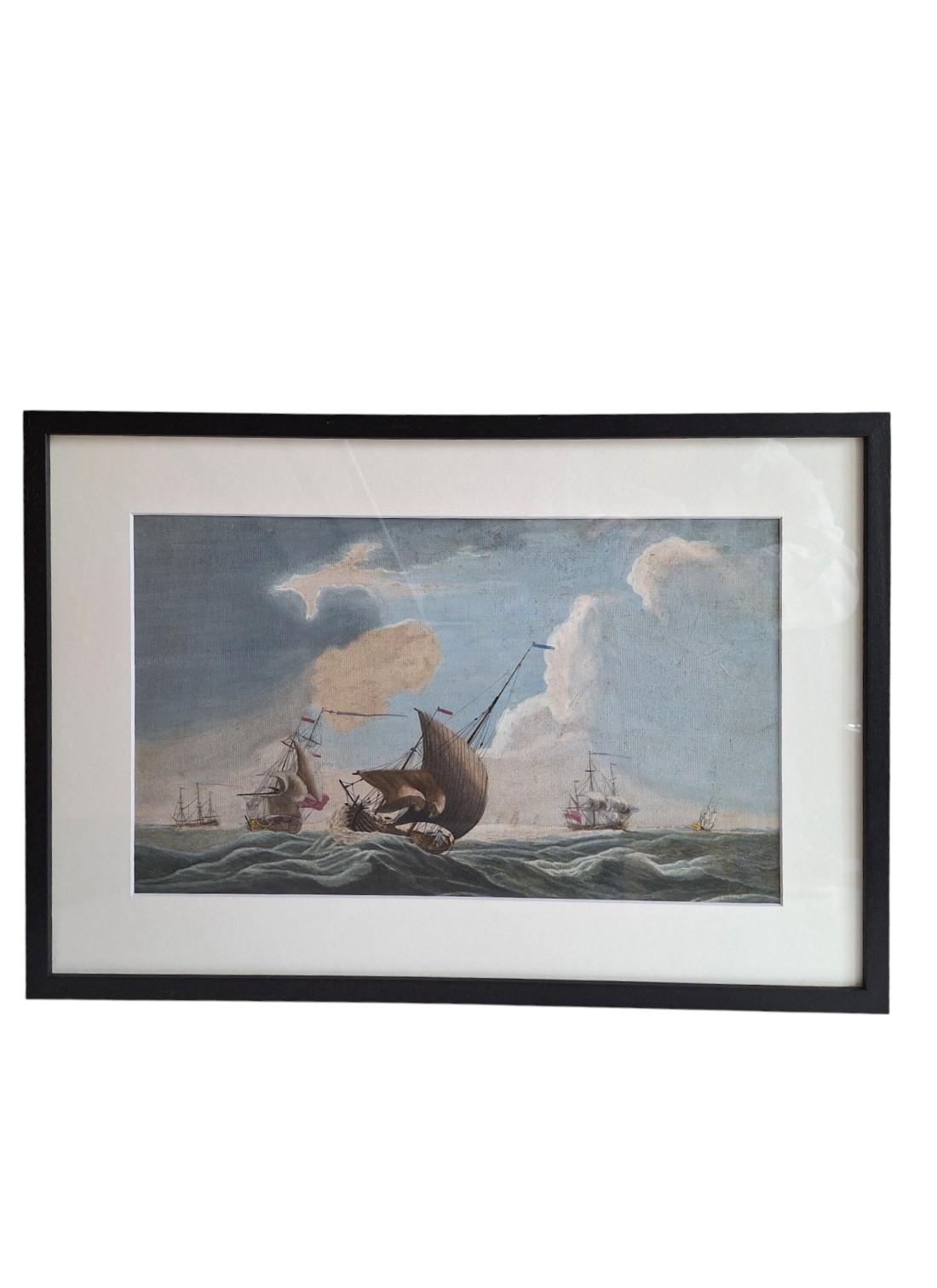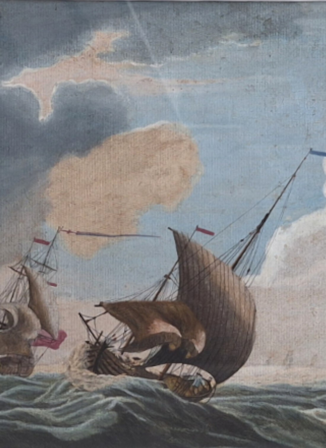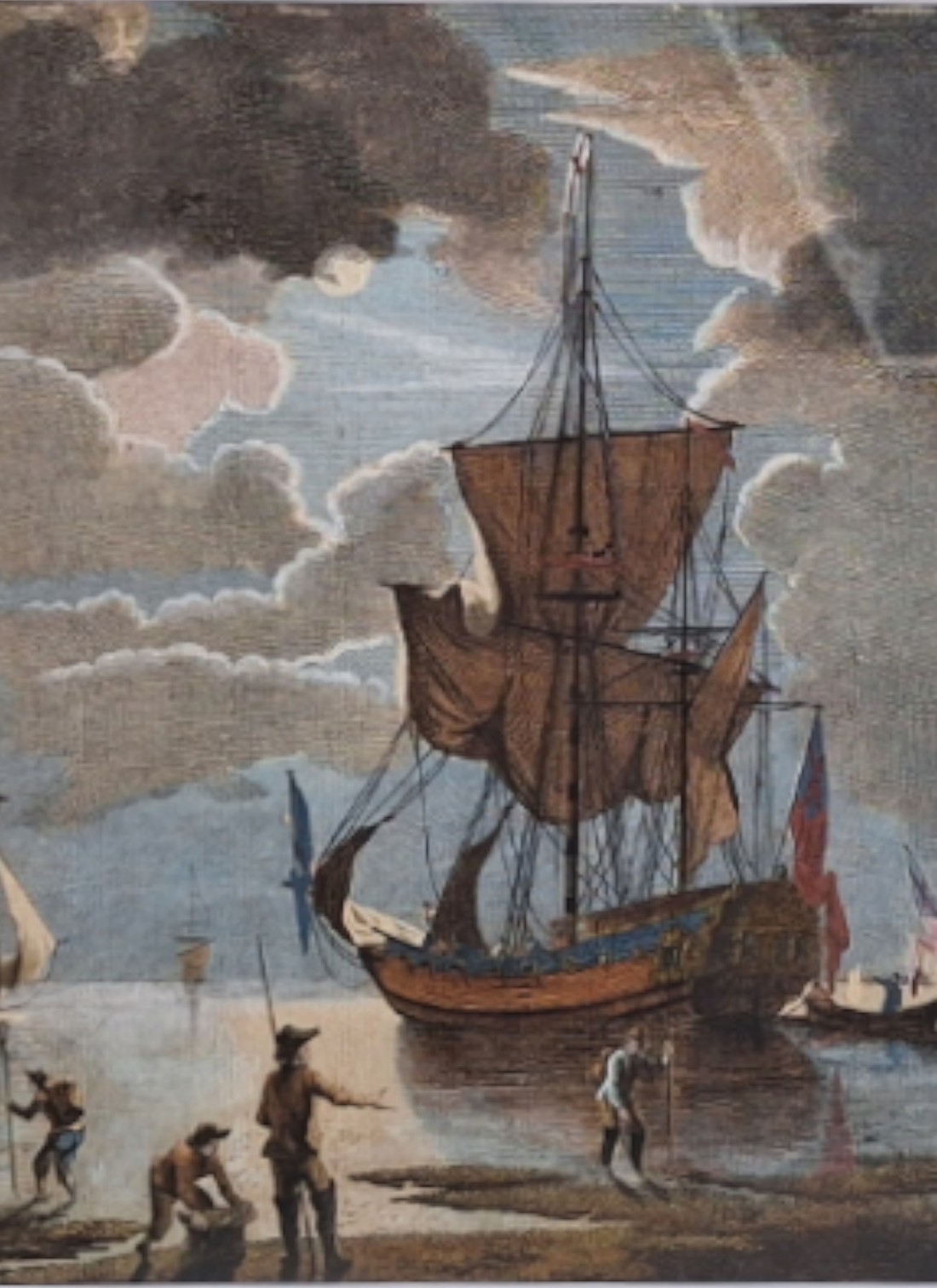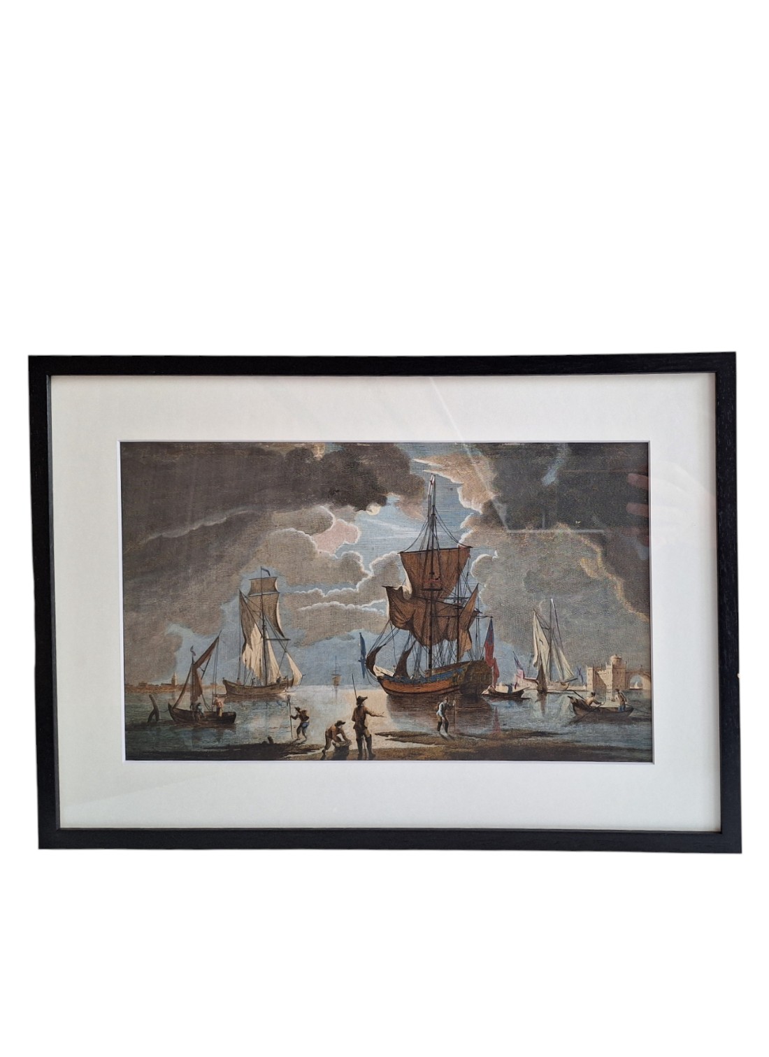 Rijetak set od četiri ručno kolorirane bakrorezne grafike koje prikazuju četiri stanja – od mirne mjesečine do oluje. Svaka scena precizno bilježi promjene svjetla, vjetra i atmosfere, odražavajući fascinaciju 18. stoljeća prirodnim silama i britanskom pomorskom tradicijom. Dvojezični natpisi na poleđini pisani krasopisom tipičnim za drugu polovicu 18.st. sugeriraju da je serija bila namijenjena tržištu na kontinentu, Francuskoj ili Nizozemskoj. Uokvirene su obostrano staklom tako da se vidi stražnja strana s podacima o izdavaču i temi.