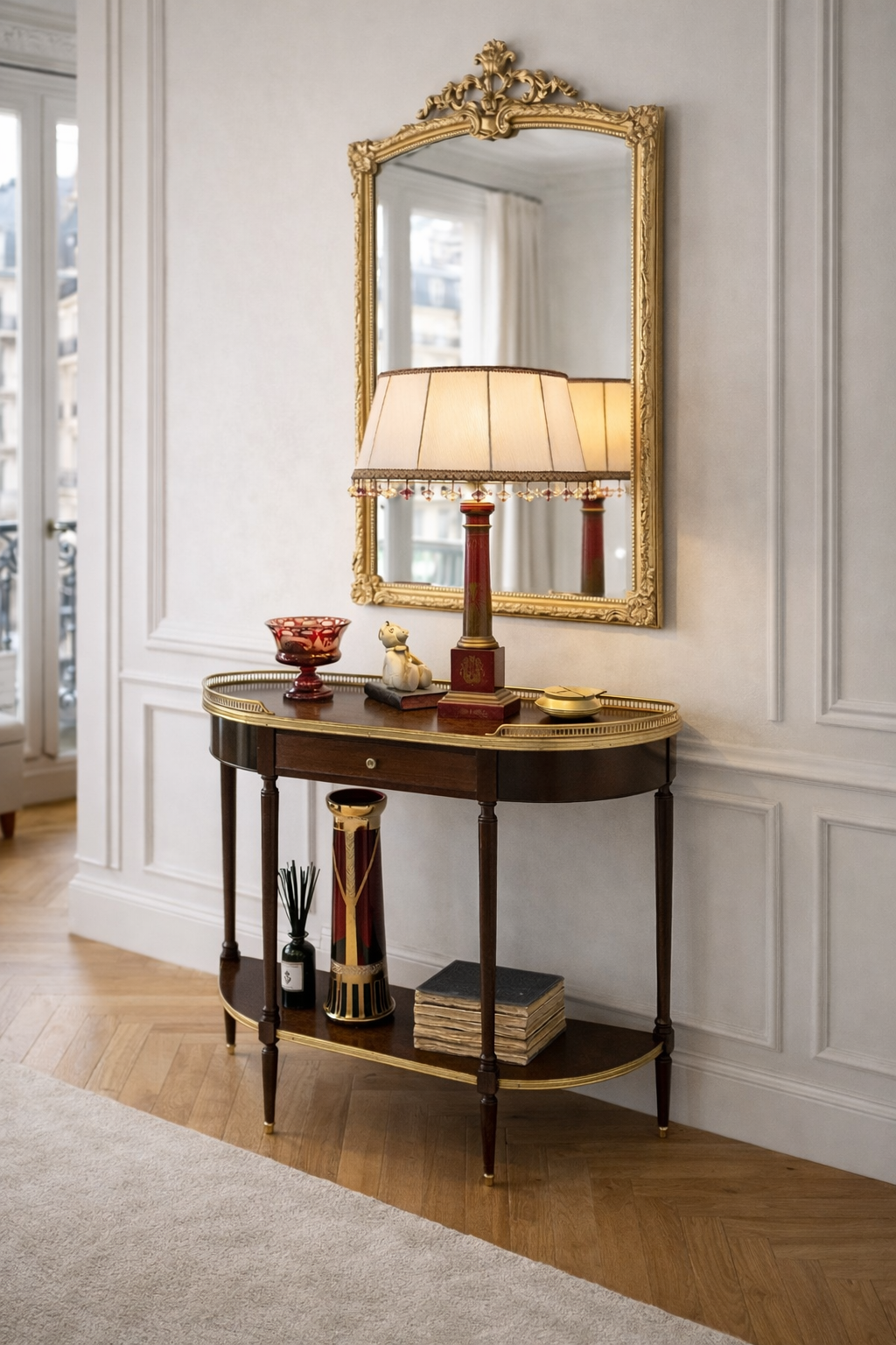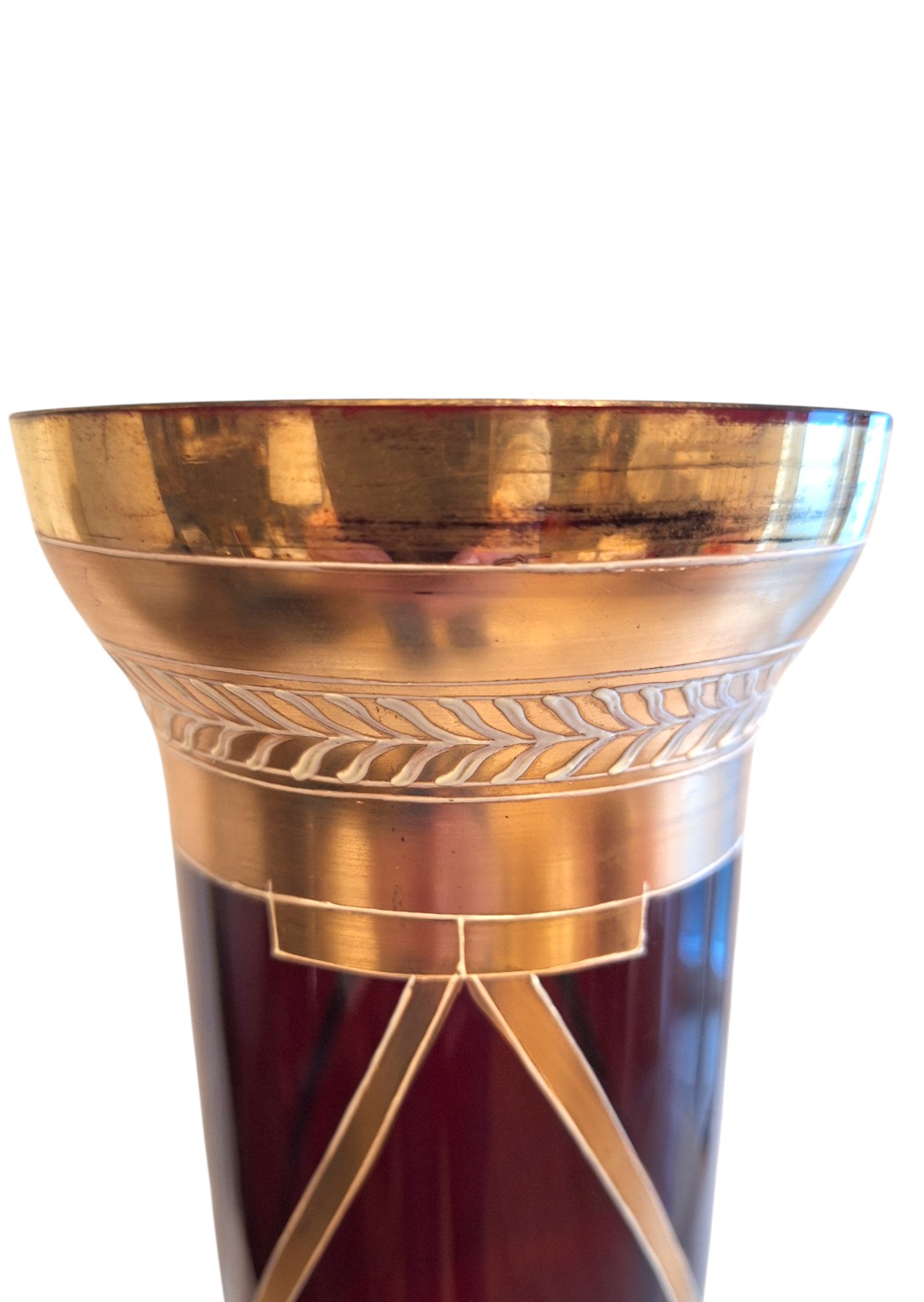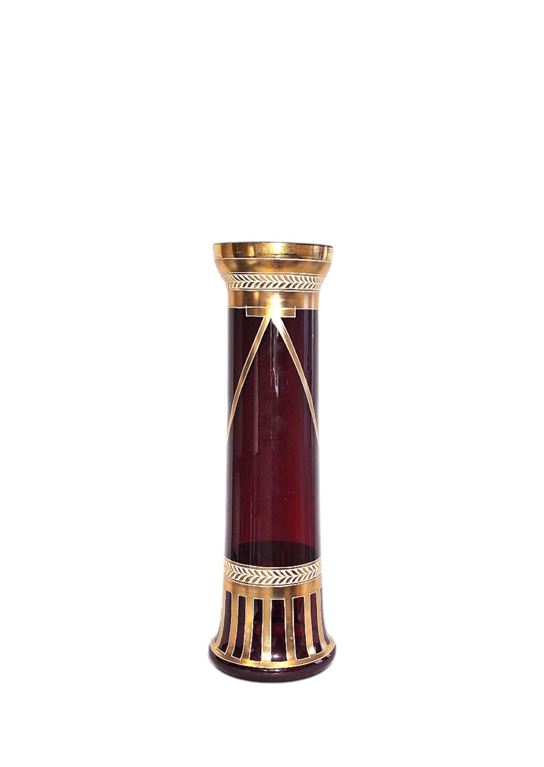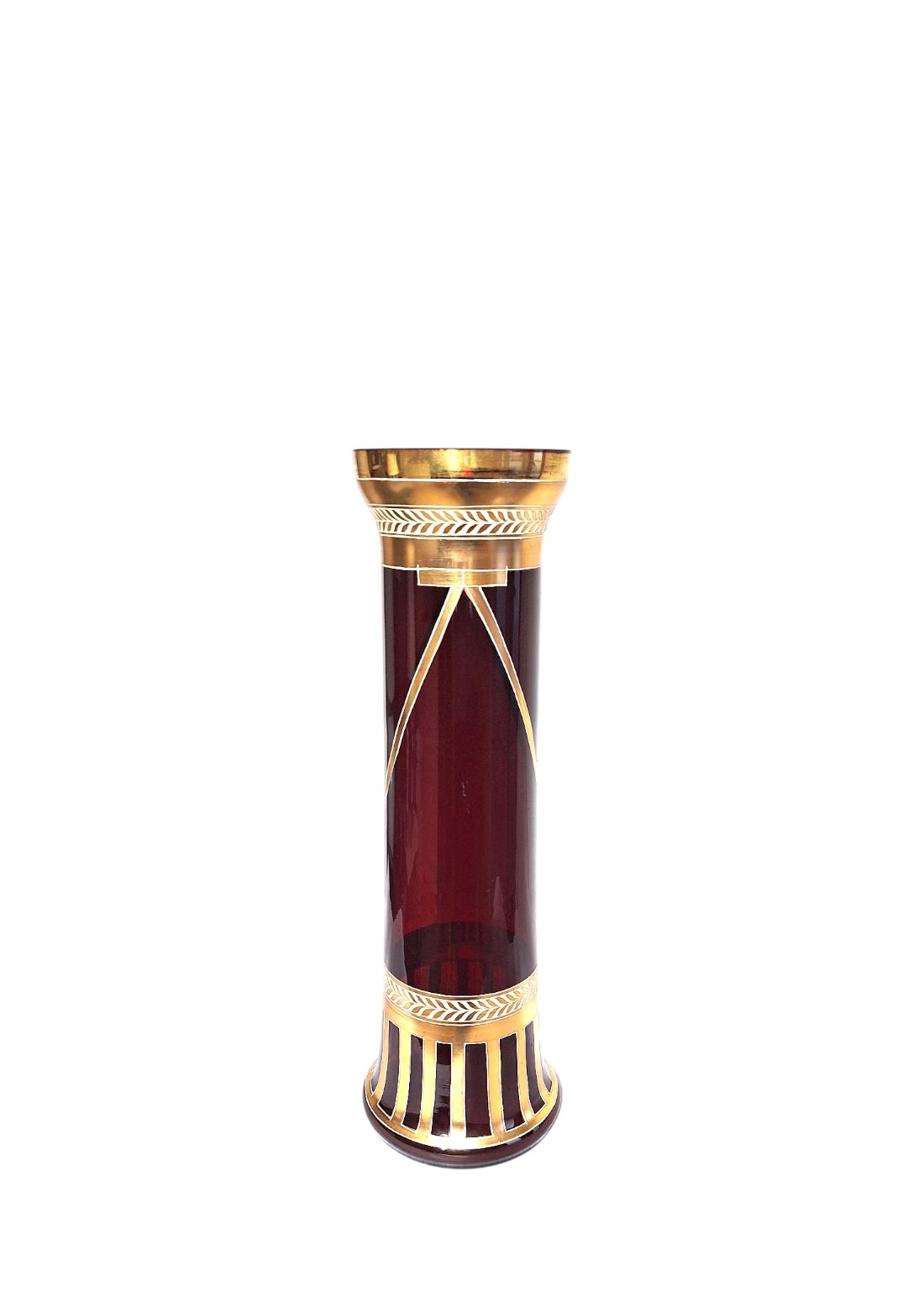 Ova visoka vaza elegantnog, uskog profila u bogatoj rubin crvenoj boji potječe iz prve polovice 20.st. s područja današnje Češke, kada su lječilišta poput Karlovy Vary bila središta europske aristokracije i kulturne elite. Vrlo kvalitetne izrade i rijetkih dimenzija (visina 40 cm). Izrađena je od duboko obojenog stakla, bogato ukrašena ručno nanešenom pozlatom neoklasicističke strogoće i istovremeno secesijskih linija, što joj daje klasičnu, gotovo imperijalnu notu.